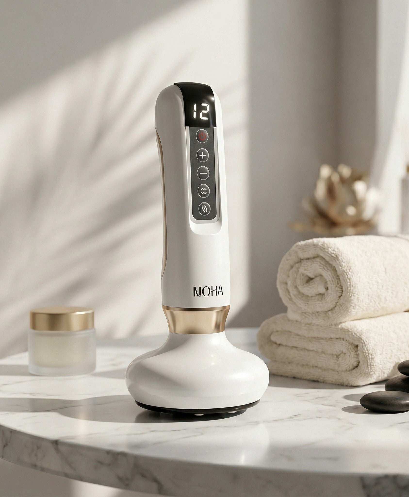 The NOHA Sculpt™ is an advanced body therapy device designed to help reduce the appearance of cellulite while improving skin texture and circulation. By combining smart scraping technology with cupping therapy, it stimulates blood flow and supports lymphatic drainage for smoother, firmer-looking skin.